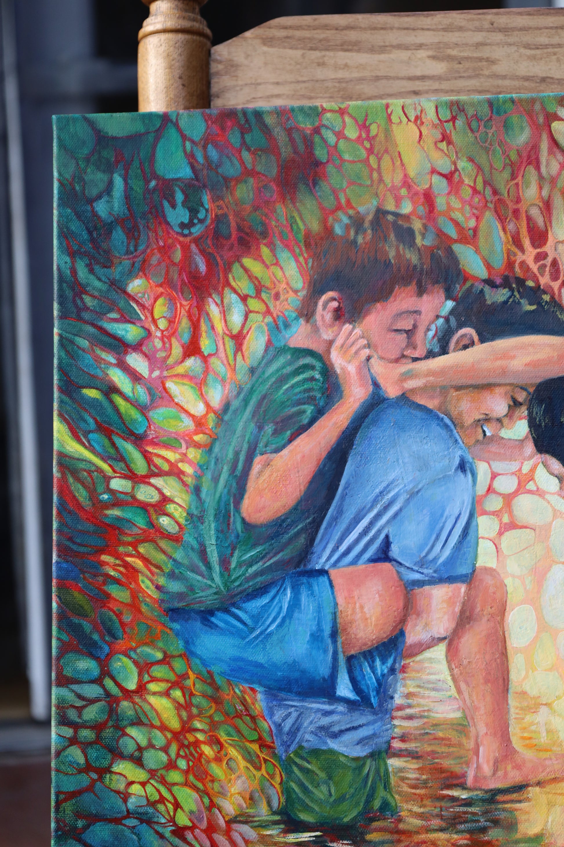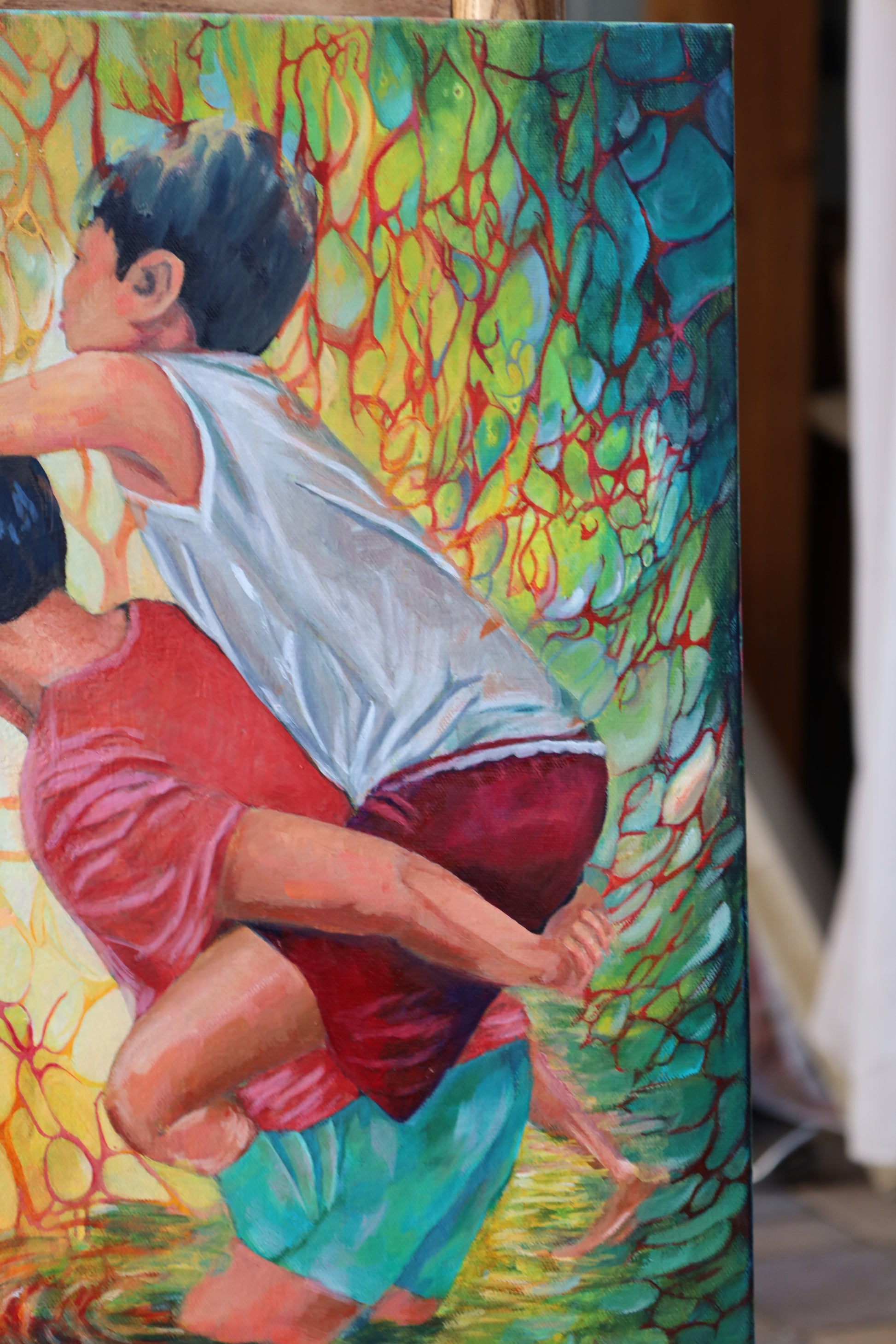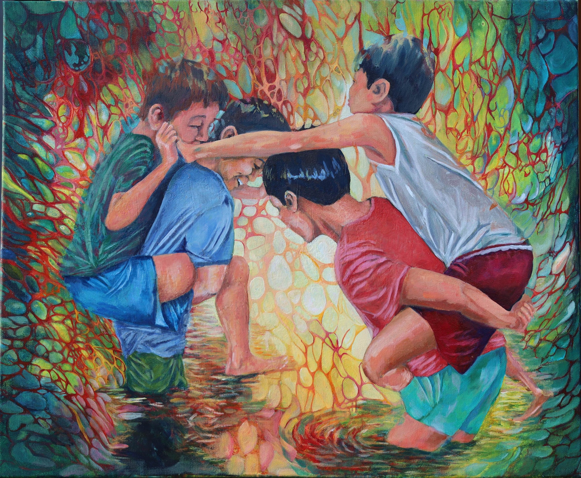 "Chicken Fight" captures the lively energy of boys engaged in playful struggle, blending realistic detail with the movement of play. This artwork invites you to experience the spontaneity and joy of youthful moments, rendered with warmth and dynamic movement that bring each figure to life. Perfect for adding a spirited, uplifting touch to any space.
